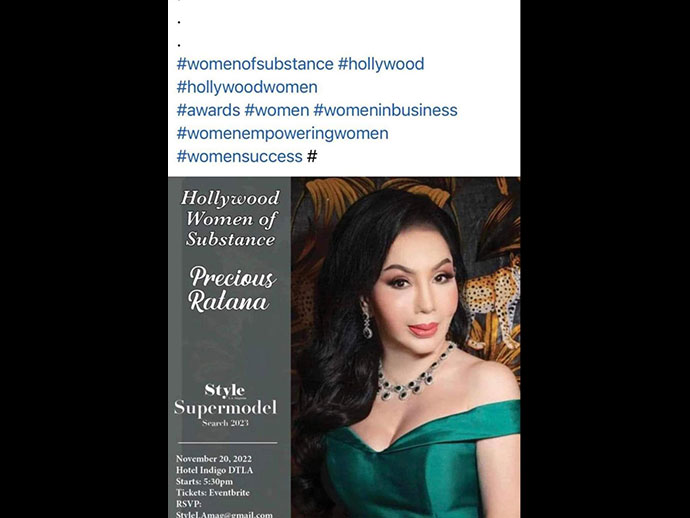 รุ่งขึ้นอีกวัน November 20, 2022 เราได้รับเชิญไปงานประกวด Super Model จัดโดย Style LA. Magazine ที่ โรงแรม Indigo, Downtown LA. ซึ่ง คุณ Precious Ratana ได้รับเลือกเป็น Hollywood Woman of Substance 2023 เป็นตำแหน่งอันทรงเกียรติตำแหน่งหนึ่ง ที่เป็น แม่แบบหรือไอด้อล ที่ มีอิทธิพลในการมองโลกในแง่ดี มีเมตตา ให้กับสุภาพสตรีหรือผู้หญิง สมควรเอาเป็นตัวอย่าง