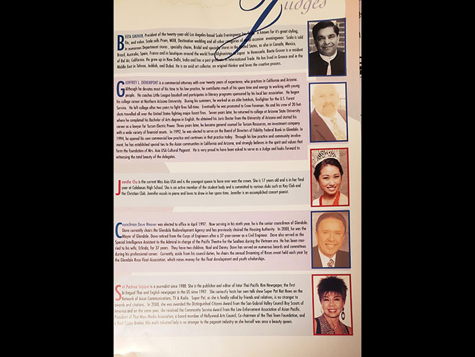 November 19, 2022 มีการจัดประกวด Miss & Mrs. Asia USA, Miss Europe Global, Miss Teen USA., Miss Latina Global, ขึ้นที่ Redondo Beach Performing Art Center, เมือง Redondo Beach ซึ่งเป็นครั้งที่ 34 ที่ทางบริษัท Virgelia Productions เป้นผู้จัด ระยะหลังๆมานี้ มีสาวไทยเข้าร่วมประกวดด้วยเป็นประจำทุกปี ตั้งแต่ปี 2005 เป็นต้นมา ดิฉันได้ให้ความสนับสนุนส่งเสริมเผยแพร่ลงใน หนังสือพิมพ์ อินเตอร์ไทยเป็นประจำทุกปี อีกทั้งยังเคยถูกชักชวนให้ร่วมประกวด Mrs. Asia – USA อีกด้วย แต่ ได้ปฎิเสธไปเนื่องด้วยไม่ถนัด จึงได้ถูกเชิญให้เป็นกรรมการตัดสินนางงามแทน ซึ่งดิฉันก็ได้รับเกียรติเป็นกรรมการตัดสินในปี 2005