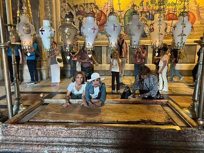 จากนั้นเราถูกพาไปเที่ยวทะเลทรายบนเนินเขาแห่งหนึ่งซึ่งรายการนี้เกือบจะถูกยกเลิกเนื่องจากความไม่ปลอดภัยจากการประทะกันของชาวปาเลสไตน์กับชาวยิว แต่ บริษัททัวร์ท้องถิ่นก็สามารถพาพวกเราเข้าไปสัมผัสการขี่อูฐได้สนุกสนานเป็นที่ถูกอกถูกใจสมาชิกทัวร์กันท่วนหน้า ก่อนจะถูกพาทาทานอาหารกลางวันท้องถิ่นซึ่งเป็นเวลาบ่ายมากแล้ว คุณทัวร์ไก๊ด์น่ารักมากๆ ได้ซื้อขนมปังชาวยิวแสนอร่อยให้ทานและทางที่เราไปขี่อูฐได้เตรียมอาหารว่างพร้อมน้ำชา กาแฟ ต้อนรับเราเต็มที่กันอย่างอิ่มหนำสำราญ หลังจากนั้นเราถูกพาไปที่ Church of the Holy Sepulchre หรือ โบสถ์พระคูหาศักดิ์สิทธิ์ โดยชาวคริสต์ออร์ทอดอกซ์เรียกว่า โบสถ์การคืนพระชนม์ เป็นโบสถ์ในย่านชุมชนชาวคริสต์ของเมืองเก่าเยรูซาเล็ม ซึ่งเป็นสถานที่ศักดิ์สิทธิ์ที่สุดของชาวคริสต์ เพราะเป็น สถานที่ตรึงกางเขนพระเยซู และ ยังเป็น สถานที่ฝังพระศพของพระเยซู และเป็นที่ที่พระองค์ฟื้นคืนพระชนม์ ขอบอกว่า เราต้องเดินขึ้นบันได ไต่เขา เนื่องเพราะทำเลของเมืองเป็นอย่างนั้น พวกเราจึงให้ไก๊ด์ไปติดต่อรถกอล์ฟพาพวกเราที่เป็นสว.ไปที่โบสถ์