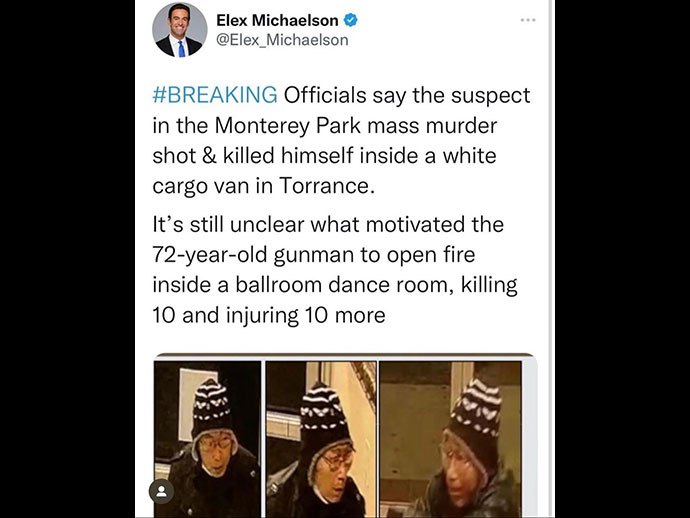 วันเสาร์ที่ 21 มกราคม ที่ผ่านมา เกิดเหตุร้ายแรง คนร้ายเข้าไปกราดยิง ทำให้มีผู้เสียชีวิต 11 คน บาดเจ็บ 9 คน ที่ Star Dance Studio, เมือง Monterey Park สถานที่ลีลาศ ที่ชุมชนไทยคุ้นเคยกันดี เพราะไปใช้บริการจัดงานรื่นเริงกันบ่อยๆ
