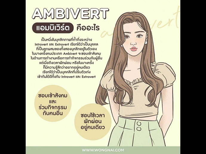 Ambivert ถือเป็นกลุ่มคนที่สามารถเข้ากันได้ดีกับคนทุกประเภท ไม่ว่าจะเป็นทั้งคนแบบ Introvert และ Extrovert ซึ่งคนกลุ่มนี้จะสามารถใช้ชีวิตในปาร์ตี้ เล่าเรื่องราวที่น่าสนใจ และมีส่วนร่วมกับกลุ่มคนได้อย่างไม่ติดขัด แต่ในขณะเดียวกันก็เป็นผู้ฟังที่ดี สามารถรับฟังอย่างตั้งใจ และเป็นที่ไว้วางใจสำหรับคนรอบข้างได้ดี สำหรับคนกลุ่มนี้แม้ว่าเขาจะชอบเข้าสังคม แต่ก็จะมีอีกมุมที่ชอบความเป็นส่วนตัวและชาร์จพลังในการอยู่คนเดียวด้วยเช่นกันค่ะ เรียกได้ว่าในเรื่องของความสัมพันธ์จะเป็นคนที่เข้าใจคนทั้งสองกลุ่ม เรียกได้ว่าปรับตัวเข้าได้ดีกับคนรักทุกประเภท