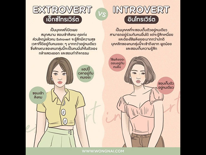 เป็นอย่างไรกันบ้างคะทุกคน คุณเป็นคนมีบุคคลิกภาพหลายแบบแตกต่างกันไป บทความนี้จะทำให้เรารู้ถึงอุปนิสัยของผู้ที่เข้ามารู้จักกับเรา แต่ไม่ว่าจะเป็นคนที่มีบุคลิกภาพแบบไหนก็ตาม ก็ไม่ได้แปลว่าจะแตกต่างหรือเข้ากันไม่ได้นะคะ เพียงแค่อาจจะมีการชาร์จพลังงานที่ไม่เหมือนกันนั่นเอง เพราะว่าคนประเภท Introvert จะรู้สึกเหนื่อยง่าย และใช้พลังงานเยอะเมื่อเข้าสังคม ในขณะที่คนประเภท Extrovert ชอบอยู่กับผู้คน และจะสามารถชาร์จพลังงานได้ดีขึ้นเมื่ออยู่กับผู้คนเยอะ ๆ ได้มากกว่าคนประเภท Introvert นั่นเองค่ะ สำหรับใครที่ได้คำตอบแบบไหนกันบ้าง ก็อย่าลืมมาแชร์คำตอบกันได้นะคะ ระหว่างทำงานกับกลุ่มคนเยอะ ๆ กับทำงานคนเดียว ก็ขอเลือกทำงานคนเดียวจะมีสมาธิในการทำงานที่ดีกว่า มักชอบชาร์จพลังให้ตัวเองด้วยการอยู่กับตัวเอง มากกว่าเข้าสังคมกับผู้คนเยอะ ๆ ขอบคุณข้อมูลดีๆจากอินเตอร์เน็ท MissSkyy มา ณใ ที่นี้ด้วย