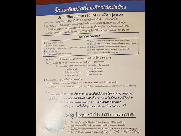ยังมีรายละเอียดเกี่ยวกับเรื่องประกันชีวิตอีกมาก ขอให้ทุกๆคนจงใช้วิจารณาญาณที่เหมาะสมกับในแต่ ชุมชนไทยที่ลอสแอนเจลิสนี้มีบริษัท และตัวแทนขายประกันชีวิตมากพอสมควรที่จะให้คุณๆหาข้อมูลด้านนี้ได้อย่างชัดเจน โชคดีค่ะ