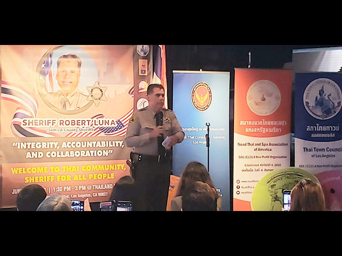 สำนักงานเชอรีฟของแอลเอ เคาน์ตี้ เป็นหน่วยงานเชอรีฟที่มีกำลังพลมากที่สุดในอเมริกา มีเจ้าหน้าที่เชอรีฟ (sworn deputies) เกือบหมื่นคน และเจ้าหน้าที่พลเรือนอีกกว่า 8,000 คน ทำหน้าที่ “บริการและคุ้มครอง” ประชาชนในพื้นที่มากกว่า 4 ล้านคน รวมถึงดูแลระบบคุกของเคาน์ตี้ ซึ่งถือว่าเป็นระบบคุกที่ใหญ่ที่สุดของอเมริกาด้วย แต่จะอย่างไรก็ตาม เชอรีฟลูน่าได้กล่าวว่า ปัจจุบัน ขาดแคลนตำรวจ 1,100 นาย และขาดแคลนเจ้าหน้าที่พลเรือน 1,400 คน ท่านยังพูดติดตลกว่า หลังจากเสร็จจากการทำความรู้จักกันแล้ว อาจได้คนไทยอาสาสมัคร์เข้ามาเป็นตำรวจจากชุมชนไทยสัก 5 – 6 คน ท่านยังเสนอแนะว่า เมื่อมีเหตุร้ายเกิดขึ้น ไม่ว่าจะเป็นเรื่องเกี่ยวกับการเหยียดผิว อาชญกรรม ล่วงละเมิด ปล้น ชิงวิ่งราว ให้แจ้งกรมตำรวจทันที