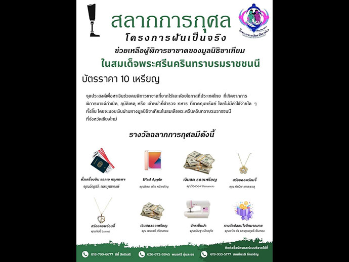 ในงานจะมีการขายสลากรางวัลการกุศลชิงโชค ใบละ $10 มีรางวัลมากมาย เริ่มต้นที่ ตั๋วเครื่องบินไป-กลับแอลเอ กรุงเทพฯ, I-Pad Apple, เงินสด $300 และ $500, สร้อยคอทองคำพร้อมจี้, จักรเย็บผ้า Brother และอื่นๆอีกมากมาย