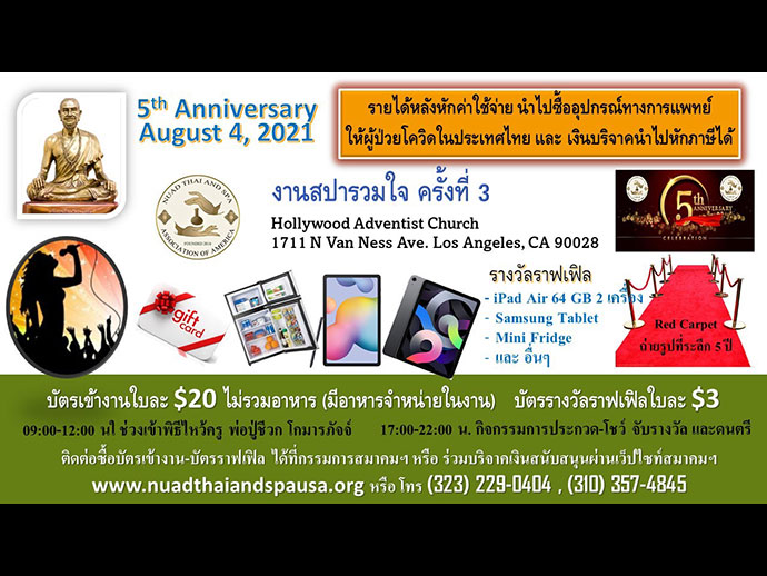 เนื่องด้วยสถานการณ์การติดเชื้อโควิดในประเทศไทยมีจำนวนมากจนเกิดปัญหาอุปกรณ์ป้องกันภัย(PPE) และอุปกรณ์การแพทย์ไม่เพียงพอต่อผู้ปฎิบัติหน้าที่และผู้ป่วย ดังนั้น สมาคมนวดไทยและสปาแห่งสหรัฐอเมริกา จึงจะจัดงานหารายได้ขึ้นในวันที่ 4 สิงหาคม 2564 ไปเพื่อนำรายได้ส่งกลับไปช่วยเหลือคนไทย หรือท่านอาจบริจาคเป็นเงินช่วยเหลือโดยตรงมาที่สมาคมทางเว็ปไซท์ www.nuadthaiandspausa.org
