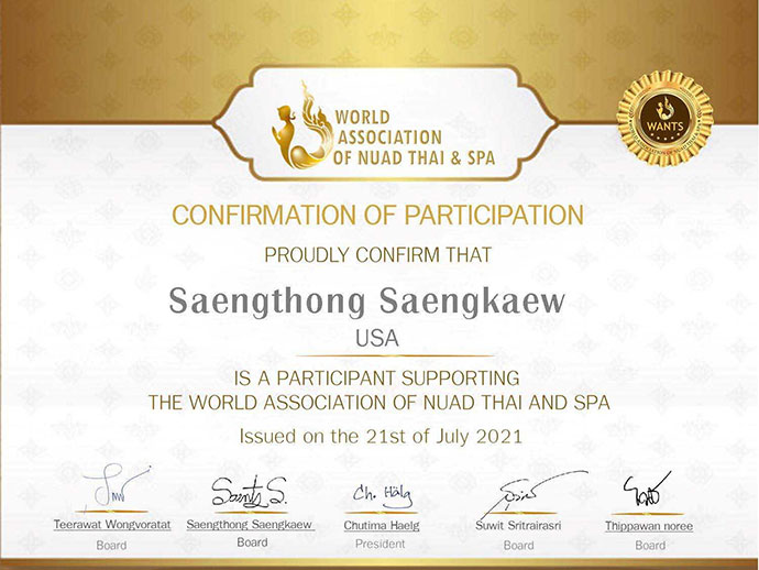 สมาคมนวดไทยและสปาแห่งสหรัฐอเมริกา ขอเชิญชวนเพื่อนร่วมอาชีพและเจ้าของธุรกิจนวดและสปาทั่วโลก โดยกรอกใบสมัครเข้าร่วมสนับสนุนการก่อตั้งสมาพันธ์โลกนวดไทยและสปา ภายในวันที่ 20 สิงหาคม 2564 ท่านจะได้รับใบยืนยันการเข้าร่วมสนับสนุนสมาพันธ์ฯ ตามตัวอย่างที่แนบมา