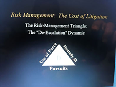 สาเหตุใหญ่ๆ ที่ทางการต้องอบรมให้ตำรวจได้ทราบก็เพราะ การฟ้องร้องเรียกค่าเสียหายจากการที่ตำรวจใช้กำลังเกินกว่าเหตุ ซึ่งเกิดเป็นข่าวบ่อย ๆ จนถึงกับการยิงทำให้เกิดการบาดเจ็บสาหัส หรือเสียชีวิต ตัวเลขเฉลี่ยที่ทางการต้องชดใช้ในขณะนี้อยู่ที่ $30,000,000 (สามสิบล้านเหรียญต่อคดีที่ถูกฟ้องร้องและแพ้) ผู้บรรยายเป็นทนายความหญิงที่มีประสบการณ์กว่า 30 ปี ในการช่วยว่าความให้ตำรวจทั่วประเทศ อดีตเป็นตำรวจ อัยการ และตำแหน่งอื่นๆ ที่เกี่ยวข้อง ช่วยเหลือตำรวจมาตลอด เธอชื่อ MILDRED K. O’LINN หรือ MISSY และเธอยังเป็นผู้รอดชีวิตจากมะเร็งเต้านมอีกด้วย (Cancer Survivor)