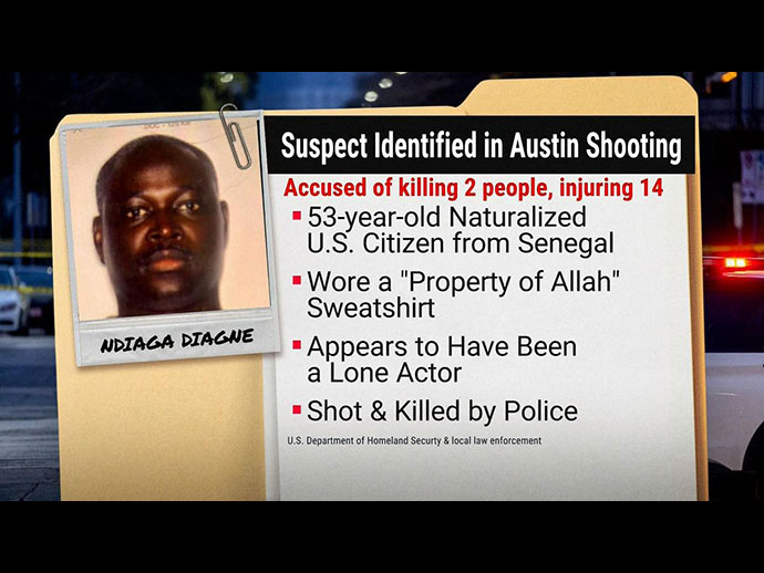 • เมื่อวันที่ 1 มีนาคม 2026 เวลาประมาณ 02.00 น. ชายอายุ 53 ปี ชื่อนาย Ndiaga Diagne ได้เปิดฉากยิงในย่านบันเทิงใจกลางเมืองออสติน รัฐเท็กซัส