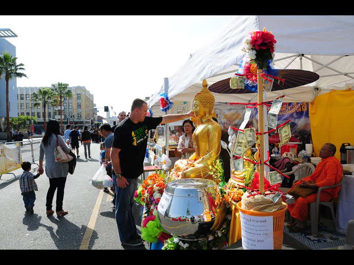 สำหรับงานไทยนิวเยียร์ สงกรานต์เฟสติวัล ที่ไทยทาวน์ เมื่อวันอาทิตย์ที่ผ่านมา ซึ่งวัดไทยฯ ส่งขบวนพาเหรด ดนตรีไทย และนาฏศิลป์ชุดใหญ่เข้าร่วมงาน และได้รับมอบหมายให้ดำเนินการด้านบุญพิธีทางศาสนาด้วยนั้น สำหรับซุ้มบุญพิธี อันประกอบด้วยพิธีทำบุญตักบาตรยามเช้า ใส่บาตรพระประจำวัน สรงน้ำพระ และถวายสังฆทานอุทิศส่วนกุศลให้ บรรพบุรุษนั้น พี่น้องไทยที่ไปร่วมงานศรัทธาร่วมบำเพ็ญกุศลอย่างอบอุ่นประทับใจ เป็นรายได้บำรุงวัดไทยฯ เป็นจำนวน 4,793.00 เหรียญ โดยแยกเป็นใส่บาตรพระประจำวัน 826.00 เหรียญ ตักบาตรตอนเช้า 861.00 เหรียญ สรงน้ำพระ 1,445.00 เหรียญ และ ถวายสังฆทาน 1,661.00 เหรียญ ขออนุโมทนในส่วนบุญครั้งนี้ ขอจงมีแต่ความสุขกายสุขใจ จิตแจ่มใสเบิกบาน และเจริญในธรรมตลอดกาล
