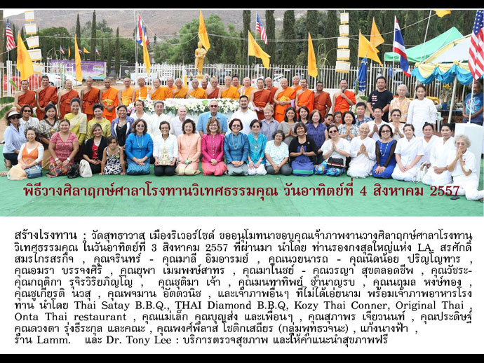 14 กันยายน 2557 วัดสุทธาวาส เมืองริเวอร์ไซด์ ขอเรียนเชิญร่วมงานบุญวันสารทไทย และร่วมทอดผ้าป่า “ทุนสร้างรัตนอุโบสถศาลา” อุทิศกัลปนาผลแด่ญาติผู้ล่วงลับ โดยเริ่มงานตั้งแต่เวลา 10.20 AM. สนใจร่วมบุญติดต่อสอบถามได้ที่โทร: (951) 360-3795, 360-3495