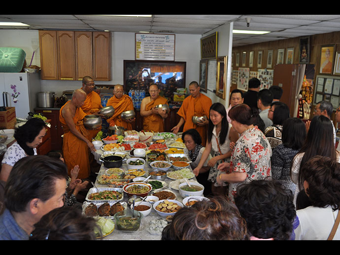 สำหรับพระคุณเจ้าพระมหาเถรานุเถร และพระธรรมทูตจากวัดต่างๆ ในอเมริกา ยุโรป เอเชีย และโซนต่างๆ ทั่วโลก ที่เดินทางมาร่วมประชุมนั้น เพียงวันแรกก็เป็นจำนวนทั้งสิ้น 210 รูปแล้ว ยังเหลือเวลาอีก 4 วัน บรรดาหลวงพี่หลวงพ่อ ทั้งหลายก็คงจะเพิ่มขึ้นตามลำดับ จากประมาณการที่คาดไว้ว่า 400 รูป น่าจะไม่ไกลจากความจริง โดยเฉพาะวันอาทิตย์ ที่ 14 มิถุนายน เวลา 06.03 น. เป็นวัดนัดหมายที่พระคุณเจ้าจะเดินบิณฑบาตรอบๆ วัดไทย ผ้ากาสาวพัสตร์เหลือง อร่ามรอบวัดไทยอย่างเป็นระเบียบเรียบร้อย จะเป็นภาพแห่งความทรงจำของพี่น้องไทยในต่างแดน และจะเป็นภาพ ประวัติศาสตร์ของวัดไทยฯ อีกครั้งหนึ่ง ขอเชิญพี่น้องไทยทุกท่านร่วมพลังกันสร้างความทรงจำอันล้ำค่าในต่างแดนร่วม ทำบุญตักบาตรพระคุณเจ้าตามวันและเวลาดังกล่าวโดยพร้อมเพรียงกัน