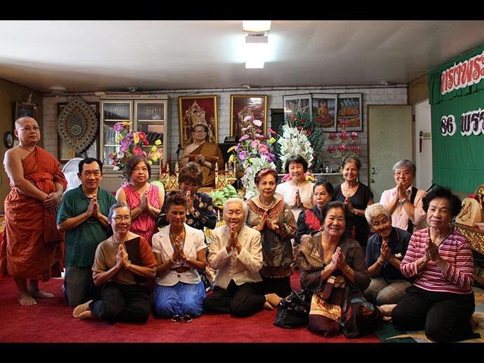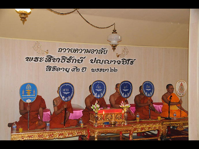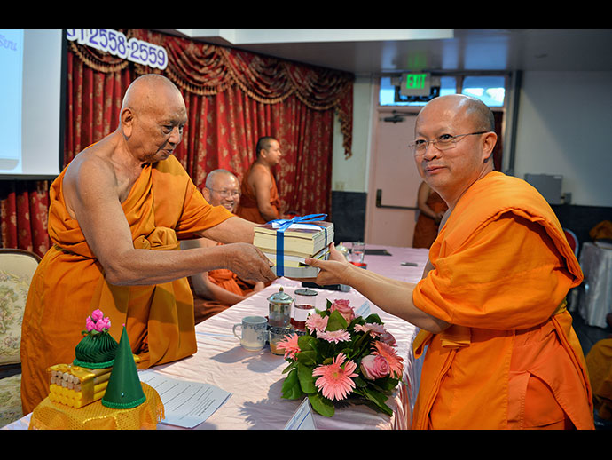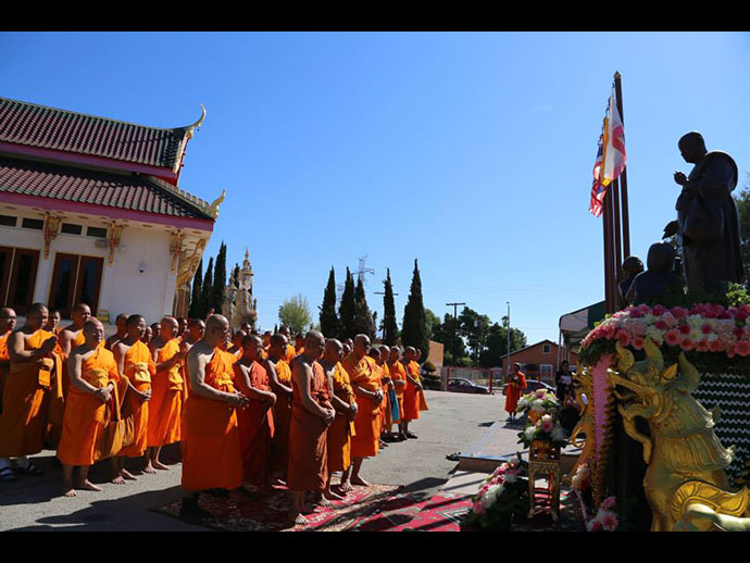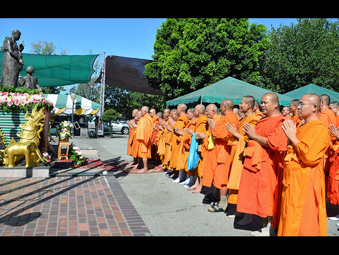 งานบุญพิธีครบรอบวันมรณภาพ “หลวงเตี่ย” พระธรรมราชานุวัตร อดีตประธานอำนวยการและเจ้าอาวาสวัดไทยฯ รูปที่ 3 เมื่อวันอาทิตย์ที่ผ่านมา พระสงฆ์ธรรมทูตจากวัดต่างๆ ในเขตแอล.เอ.และใกล้เคียงจำนวน 69 รูป รับบิณฑบาตจากญาติโยม รอบๆ อุโบสถศาลาแล้ว ได้พร้อมใจกันประกอบพิธีสักการะบูชา คุณหน้าอนุสาวรีย์หลวงเตี่ย หลวงพ่อใหญ่ ท่านเจ้าคุณ พระเทพมงคลวิเทศ วางพานดอกไม้สักการะ ครูอาสาประจำการ 1 ปี ขับเสภาสดุดีเกียรติคุณหลวงเตี่ยแล้ว หลวงพ่อใหญ่ นำพระสงฆ์ สวดสังฆคุณ 3 จบ บูชาคุณหลวงเตี่ย แล้วขึ้นสู่อุโบสถศาลา ฟังพระธรรมเทศนาโดย ท่านเจ้าคุณพระราชพุทธิ วิเทศ ประธานสมัชชาสงฆ์ไทย แล้วพระสงฆ์สมณศักดิ์ 10 รูป สวดธรรมนิยามสูตร แล้วพร้อมใจกันถวายภัตตาหารเพล