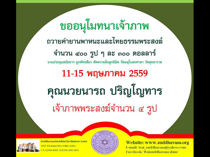 ประดิษฐ์-ดวงตา รุ่งธีระกุล ขอเรียนเชิญสาธุชนร่วมงานบุญวันขึ้นปีใหม่ ทอดผ้าป่าสามัคคี สร้างพื้นชั้นบน-ชั้นล่าง รัตนอุโบสถศาลา วัดสุทธาวาส ในวันศุกร์ ที่ 1 มกราคม 2559 ณ ศาลาบุญ วัดสุทธาวาส เมืองริเวอร์ไซด์ งานเริ่มเวลา 10.00 am. สนใจร่วมบุญติดต่อสอบถามได้ที่ โทร: (951) 360-3795, (951) 360-3495 ติดตามข่าวสาร https://www.facebook.com/watsuddhavasa.sbmc
