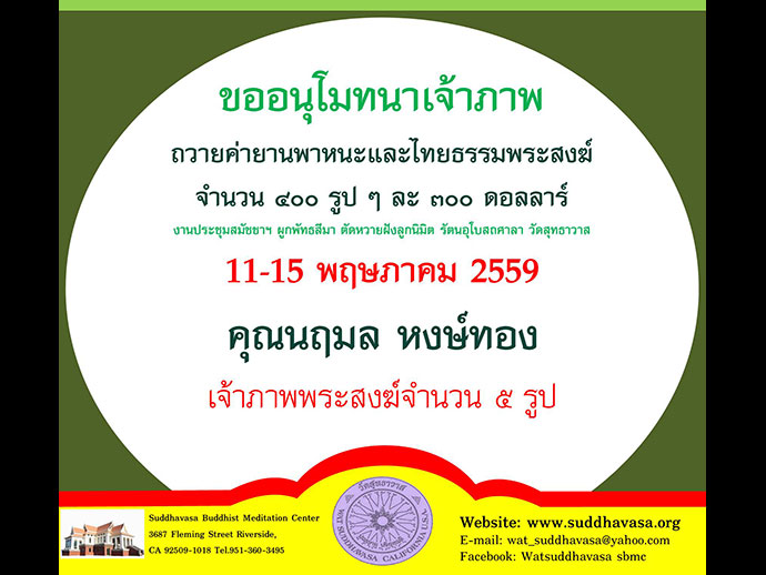สืบพันธ์-แตงร้าน หงษ์ทอง ขอเรียนเชิญสาธุชนร่วมงานบุญวันมาฆบูชา เวียนเทียนรอบรัตนอุโบสถศาลา ทอดผ้าป่าสามัคคี สร้างพื้นชั้นบน-ชั้นล่าง รัตนอุโบสถศาลา วัดสุทธาวาส ในวันอาทิตย์ ที่ 14 กุมภาพันธ์ 2559 ณ ศาลาบุญ วัดสุทธาวาส เมืองริเวอร์ไซด์ งานเริ่มเวลา 10.00 am. สนใจร่วมบุญติดต่อสอบถามได้ที่ โทร: (951) 360-3795, (951) 360-3495 ติดตามข่าวสาร https://www.facebook.com/watsuddhavasa.sbmc