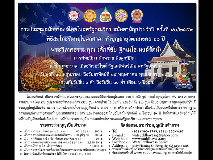 นวยนารถ ปริญโญทาร สุรเดช ยุพา เมฆพงษ์สาธร บุญส่ง อนันตสุคนธ์ โอภาส หลีหเจริญกุล นิดน้อย ปริญโญทาร ขอเรียนเชิญสาธุชนร่วมงานพิธีอัญเชิญหน้าบันพระราชทานขึ้นประดิษฐาน รัตนอุโบสถศาลา (ด้านทิศตะวันออก) วัดสุทธาวาส ในวันอาทิตย์ ที่ 13 มีนาคม 2559 ณ ศาลาบุญ วัดสุทธาวาส เมืองริเวอร์ไซด์ งานเริ่มเวลา 10.00 am. สนใจร่วมบุญติดต่อสอบถามได้ที่ โทร: (951) 360-3795, (951) 360-3495 ติดตามข่าวสาร https://www.facebook.com/watsuddhavasa.sbmc