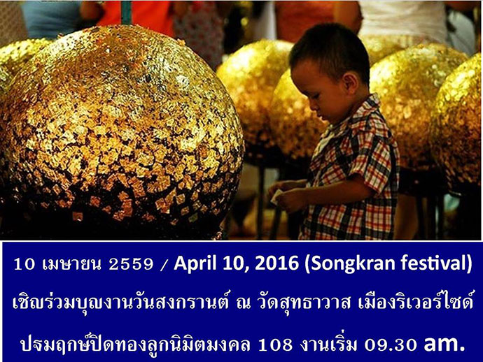 ฉวีวรรณ เสนาภักดิ์ มนัส ทองเพ็ชรนิล ขอเรียนเชิญสาธุชนร่วมงานบุญวันสงกรานต์วัดสุทธาวาส ในวันอาทิตย์ ที่ 10 เมษายน 2559 ณ ศาลาบุญ วัดสุทธาวาส เมืองริเวอร์ไซด์ งานเริ่มเวลา 10.00 am. ติดต่อสอบถามได้ที่ โทร: (951) 360-3795, (951) 360-3495 ติดตามข่าวสาร https://www.facebook.com/watsuddhavasa.sbmc, http://www.suddhavasa.org/