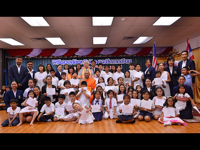 การเรียนการสอนภาษาไทยและวัฒนธรรมไทย ภาคฤดูร้อน โรงเรียนพุทธศาสนาวัดไทยลอสแองเจลิส ระหว่างวันที่ 13 มิถุนายน ถึง 14 สิงหาคม 2559 รวม 9 สัปดาห์ ได้ถึงบทสุดท้ายไปแล้วเมื่อสุดสัปดาห์ที่ผ่านมา โดยคณะครูอาสาฯ จาก โครงการสอนภาษาไทยและวัฒนธรรมไทยในต่างประเทศ คณะครุศาสตร์ จุฬาฯ นำโดย อ.ดร.ปิยานี จิตร์เจริญ และน้องๆ ร่วมใจกันจัดพิธีมอบสัมฤทธิบัตรและปิดภาคเรียน วันเสาร์ที่ 13 สิงหาคม 2559 รศ.ดร.บัญชา ชลาภิรมย์ รักษาการคณบดี คณะครุศาสตร์ และรองอธิการบดีจุฬาฯ ฝ่ายกิจการนิสิต ให้เกียรติเดินทางจากประเทศไทยมาเป็นประธานมอบให้เด็กๆ เชื้อสายไทยจำนวน 114 คน