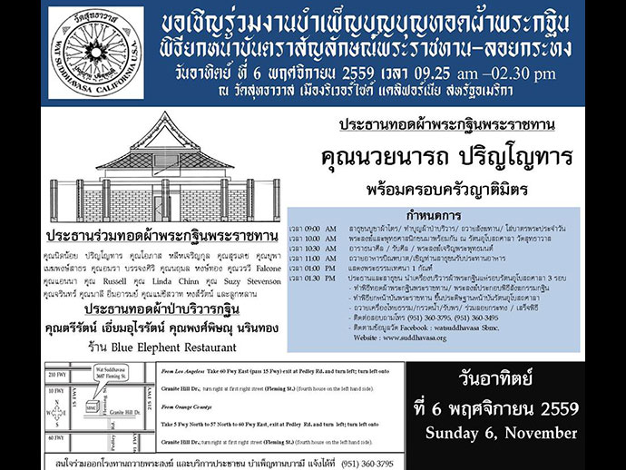 วัดสุทธาวาส จะจัดงานทำบุญทอดผ้าพระกฐินพระราชทาน และลอยกระทง หาทุนสร้างโรงทานอาหาร ในวันอาทิตย์ที่ 6 พฤศจิกายน 2559 นี้ จึงขอเชิญสาธุชนร่วมบุญสร้างโรงทานอาหารด้วยกัน เริ่มงานตั้งแต่เวลา 09.30 เป็นต้นไป ติดต่อสอบถามได้ที่ โทร: (951) 360-3795, (951) 360-3495 ติดตามข่าวสาร https://www.facebook.com/watsuddhavasa.sbmc, www.suddhavasa.org
