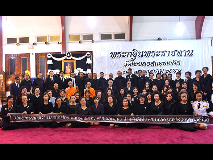 งานทอดผ้าพระกฐินพระราชทาน และงานลอยกระทงวัดไทยแอลเอ ประจำปีพุทธศักราช 2559 ซึ่งกำหนดงานวันเสาร์-อาทิตย์ที่ 29-30 ตุลาคม ที่ผ่านมานั้น คณะกรรมการจัดงานได้มีมติงดกิจกรรมด้านบันเทิงเริงรมย์ทั้งหมด ไม่ว่าจะเป็นการ แสดงทางวัฒนธรรมประเพณี หรือการประกวดต่างๆ เพื่อเป็นการถวายความอาลัยแด่พระบาทสมเด็จพระปรมินทรมหา ภูมิพลอดุลยเดช ด้วยสำนึกในพระมหากรุณาธิคุณหาที่สุดมิได้ โดยมีเพียงตลาดอาหารและบูธสินค้าพื้นเมืองให้พี่น้องไทยที่ มาร่วมบุญทอดผ้าพระกฐินพระราชทาน ได้เลือกซื้อหานำไปใช้สอยตามความจำเป็นเท่านั้น