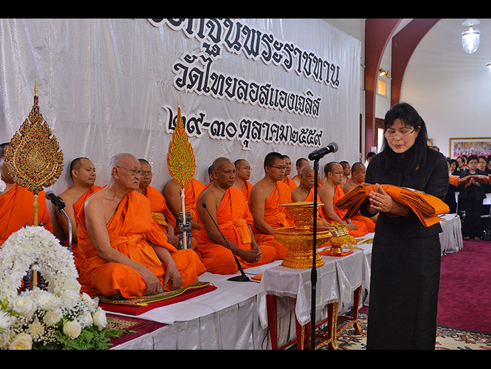 เป็นที่น่าชื่นใจอย่างยิ่งที่ช่วงเวลาแห่งการทอดผ้าพระกฐินพระราชทาน พี่น้องไทยให้ความสนใจเข้าร่วมกันอย่างหนาตา อบอุ่นยิ่ง ท่านรองกงสุลใหญ่ ณ นครลอสแองเจลิส คุณสรศักดิ์ สมรไกรสรกิจ และภริยา ผู้แทนท่านกงสุลใหญ่เป็นประธาน โดยมี คุณวิรัตน์ วสันตชาติ และลูกสาว คุณหัสดี วสันตชาติ เป็นผู้ถวายผ้าพระกฐินพระราชทาน ซึ่งโดยมติคณะสงฆ์วัดไทย มอบถวายหลวงพ่อใหญ่ ท่านเจ้าคุณพระเทพมงคลวิเทศ เจ้าอาวาสและประธานกรรมการอำนวยการ เป็นองค์ครองในพิธี กรานผ้าพระกฐิน ประกอบพิธีอปโลกนกรรม พระมหาสมัย ฐานจาโร และ พระมหาประเวช ปัญญาวชิโร เป็นพระคู่สวด จากนั้นก็เป็นการถวายอัฏฐบริขารบริวารกฐิน จบแล้วหลวงพ่อใหญ่นำพระสงฆ์แสดงอนุโมทนากถา ถวายพระพรแด่ พระบาทสมเด็จพระปรมินทรมหาภูมิพลอดุลยเดช ก็เป็นเสร็จพิธี