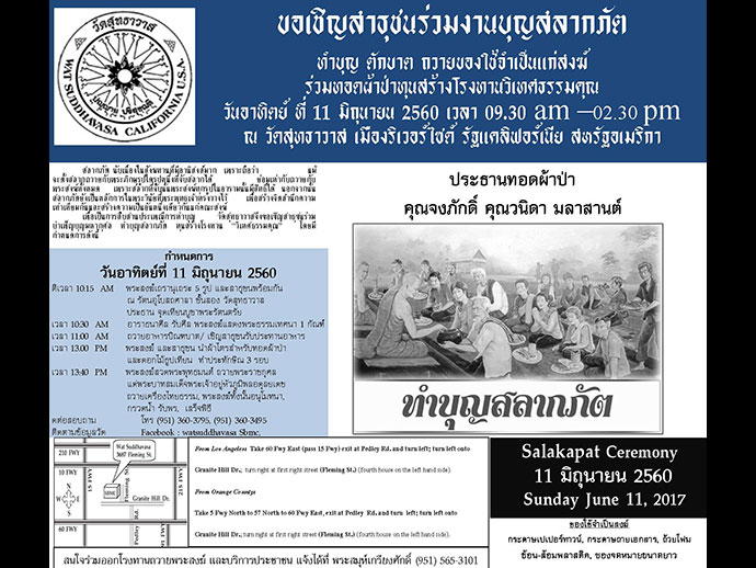 วันอาทิตย์ที่ 11 มิถุนายน 2560 วัดสุทธาวาส จะจัดงานบุญสลากภัต ทำบุญทอดผ้าป่าสร้างโรงทานวิเทศธรรมคุณ โดยมีคุณจงภักดิ์ คุณวนิดา มลาสานต์ เป็นประธานทอดผ้าป่า จึงขอเชิญชวนสาธุชนร่วมบุญสร้างโรงทานอาหารด้วยกัน ติดต่อสอบถามได้ที่ โทร: (951) 360-3795, (951) 360-3495 ติดตามข่าวสาร https://www.facebook.com/watsuddhavasa.sbmc, www.suddhavasa.org