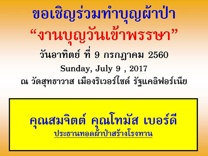 วันอาทิตย์ที่ 9 กรกฎาคม 2560 วัดสุทธาวาส จะจัดงานบุญวันอาสาฬหบูชา-เข้าพรรษา ทำบุญทอดผ้าป่าสร้างโรงทานวิเทศธรรมคุณ โดยมีคุณสมจิตต์ คุณโทมัส เบอร์ดี เป็นประธานทอดผ้าป่า จึงขอเชิญชวนสาธุชนร่วมบุญสร้างโรงทานอาหารด้วยกัน ติดต่อสอบถามได้ที่ โทร: (951) 360-3795, (951) 360-3495 ติดตามข่าวสาร https://www.facebook.com/watsuddhavasa.sbmc, www.suddhavasa.org
