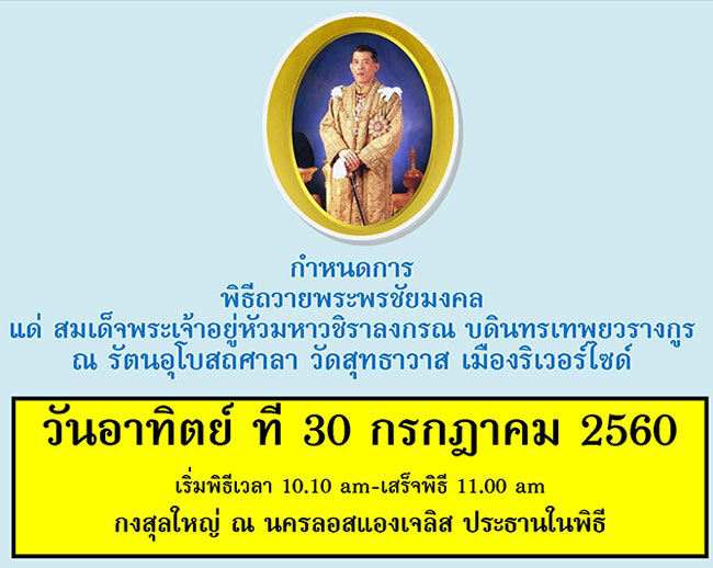 30 กรกฎาคม 2560 วัดสุทธาวาสจัดพิธีจุดเทียนถวายพระพรชัยมงคล แด่ สมเด็จพระเจ้าอยู่หัวมหาวชิราลงกรณ บดินทรเทพยวรางกูร ณ รัตนอุโบสถศาลา วัดสุทธาวาส เนื่องในวันคล้ายวันพระราชสมภพ โดยมีนายธานี แสงรัตน์ กงสุลใหญ่ ณ นครลอสแองเจลิส เป็นประธานฝ่ายบ้านเมือง งานเริ่มเวลา 10.00 น. เสร็จพิธี 11.20 น. จึงขอเชิญชวนสาธุชนร่วมงานพิธีสำคัญดังกล่าวโดยพร้อมเพียงกัน