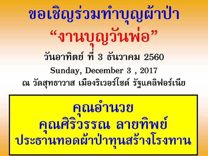 วันอาทิตย์ที่ 3 ธันวาคม 2560 วัดสุทธาวาส จะจัดงานบุญวันพ่อ โดยมีคุณอำนวย คุณศิริวรรณ ลายทิพย์ เป็นประธานทอดผ้าป่าทุนสร้างโรงทาน จึงขอเชิญชวนสาธุชนร่วมบุญสร้างโรงทานอาหารด้วยกัน ติดต่อสอบถามได้ที่ โทร: (951) 360-3795, (951) 360-3495 ติดตามข่าวสาร https://www.facebook.com/watsuddhavasa.sbmc เว็ปไซต์ www.suddhavasa.org
