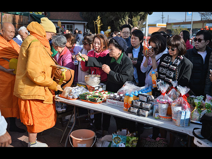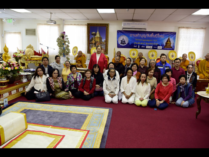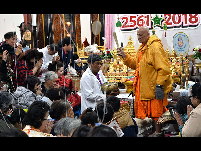 รุ่งเช้าวันจันทร์ที่ 1 มกราคม 2561 เป็นพิธีทำบุญตักบาตรยามเช้าต้อนรับปีใหม่ พี่น้องไทยศรัทธามาร่วมทำบุญตักบาตร อย่างอุ่นหนาฝาคั่งเช่นเคย ไม่สนใจความหนาวเย็นรอบข้างมีหน้าตาเอิบอิ่มด้วยรอยยิ้มสดใส หลวงพ่อใหญ่ ท่านเจ้าคุณ พระเทพมงคลวิเทศ นำพระสงฆ์วัดไทยฯ และวัดอื่นๆ ที่อยู่ใกล้เคียงกันเดินลงจากอุโบสถศาลารับบิณฑบาต จากญาติ โยมที่ยืนเรียงรายรอบๆ อุโบสถศาลาถึง 2 รอบ ประมาณว่าพี่น้องไทยที่ศรัทธาร่วมบุญตักบาตรไม่น่าจะต่ำกว่า 1,000 คน เพราะต่างก็เบียดเสียดกันใส่บาตรพระคุณเจ้าทั้ง 2 รอบ คณะสงฆ์วัดไทยฯ โดยหลวงพ่อใหญ่ขออนุโมทนาขอบคุณ ในศรัทธาของพี่น้องไทยทุกท่าน ขอให้ก้าวเดินทางบนเส้นทางชีวิตตลอดปีใหม่ ด้วยจิตใจที่มั่นคงเข้มแข็ง คงที่ไม่เปลี่ยน แปลง จิตใจที่มั่นคงคือจิตใจที่เข้าถึงธรรม ย่อมอยู่ในโลกนี้อย่างเป็นสุขยิ่ง