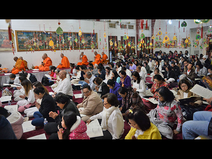 งานบุญพิธีสวดมนต์ข้ามปีส่งท้ายปีเก่าต้อนรับปีใหม่ ซึ่งวัดไทยฯ โดยหลวงพ่อใหญ่ ท่านเจ้าคุณพระเทพมงคลวิเทศ จัดขึ้นเมื่อวันที่ 31 ธันวาคม 2560 และวันที่ 1 มกราคม 2561 โดยคืนวันที่ 31 ธันวาคม พิธีเริ่มแต่เวลา 19.30 น. เป็นต้นไป พี่น้องไทยศรัทธามาร่วมสวดมนต์กันมากมาย จนสถานที่ที่ทางวัดจัดไว้รับรอง คือ อุโบสถศาลาชั้นบน และชั้นล่าง และบนอาคารเรียนศาลาอเนกประสงค์ไม่มีที่ว่างเลย หลวงพ่อใหญ่นำสวดมนต์เจ็ดตำนาน สวดธรรมจัก กัปปวัตนสูตร สวดนพเคราะห์ตามกำลังวัน สวดอิติปิโส 108 จบ เป็นบทสุดท้ายเป็นเวลาเที่ยงคืนพอดี แล้วพระสงฆ์ ทั้งนั้นเจริญชัยมงคลคาถาอวยพรต้อนรับปีใหม่ หลวงพ่อใหญ่พรมน้ำพระพุทธมนต์ แล้วมอบของที่ระลึกปฏิทินและ วัตถุมงคลเสริมพลังใจพลังชีวิตสำหรับก้าวไปบนเส้นทางแห่งปีใหม่อย่างเข้มแข็งและเป็นสุข