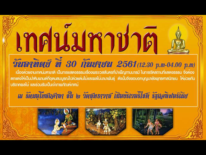 วัดพระธาตุดอยสุเทพ ยูเอสเอ เมืองชิโนฮิลส์ รัฐแคลิฟอร์เนีย ขอเชิญพุทธศาสนิกชนร่วมงานบำเพ็ญบุญกุศล งานวันคล้ายวันสวรรคตพระบาทสมเด็จพระปรมินทรมหาภูมิพลอดุลยเดช และทำบุญวันออกพรรษา-เทโวโรหณะ ในวันอาทิตย์ที่ 14 ตุลาคม 2561 ตั้งแต่เวลา 10.30 น. เป็นต้นไป ร่วมทำบุญตักบาตร ถวายมหาสังฆทาน ฟังพระธรรมเทศนา บังสุกุลอุทิศ ถวายผ้าป่าสามัคคี ติดต่อสอบถามได้ที่ Tel: 909-606-9502 E-mail: watchino18@gmail.com