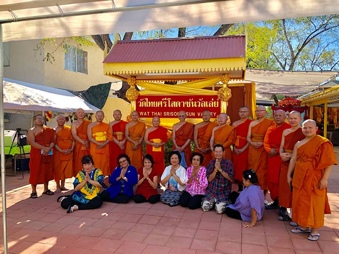 คุณพูนศักดิ์จึงได้ปรึกษาหารือกับเพื่อนๆ ร่วมกันจัดตั้งองค์กรพุทธ คือ ศูนย์พุทธศาสนาฝ่ายเถรวาทขึ้นมา โดยคุณพูนศักดิ์ได้รับเลือก เป็นประธานศูนย์คนแรก เมื่อปี พ.ศ. 2514 แล้วได้เดินทางกลับเมืองไทยเพื่อปรึกษาหารือเรื่องสร้างวัดไทยกกับบิดามารดา ซึ่งทั้ง สองท่านมีความศรัทธาและเห็นชอบด้วย จึงได้บริจาคเงินซื้อที่ดินจำนวน 5 ไร่ ในเมืองนอร์ท ฮอลลีวูด มอบให้ลูกชายทำพิธีถวายแด่ สมเด็จพระสังฆราช ปุณณสิริมหาเถร องค์ที่ 17 แห่งกรุงรัตนโกสินทร์ ขณะดำรงสมณศักดิ์ ที่ สมเด็จพระวันรัต เสด็จเยือนอเมริกา ในฐานอาคันตุกะของรัฐบาลอเมริกัน โดยได้ทรงวางศิลาฤกษ์สร้างวัดเมื่อวันที่ 19 พฤษภาคม 2515 ดำเนินการก่อสร้างจนสำเร็จ เป็น “วัดไทย” แห่งแรกในสหรัฐอเมริกา