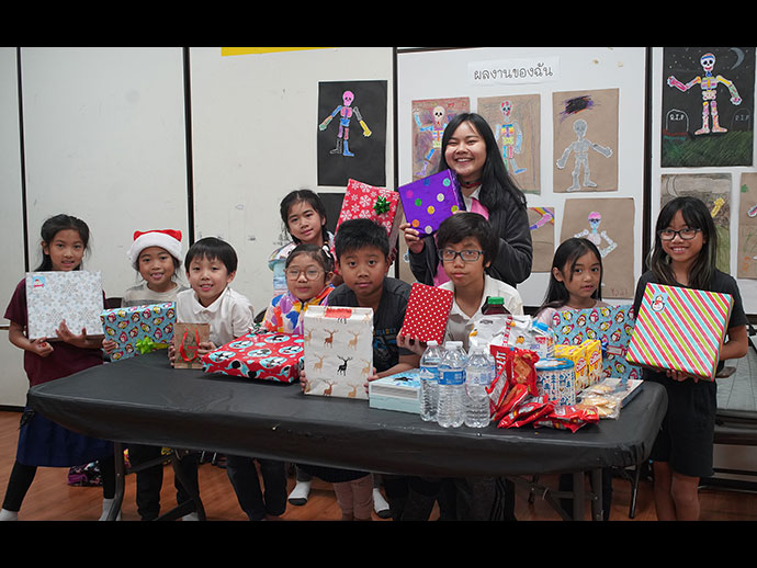 คณะครูอาสาได้พร้อมใจกันจัดงานส่งท้ายปีเก่าต้อนรับปีใหม่เลี้ยงสังสรรค์ระหว่างครูและนักเรียน และเชิญชวนผู้ปกครอง จัดของขวัญมูลค่าไม่ต่ำกว่า 10 เหรียญ ให้บุตรหลานของตนนำมาจับสลากแลกเปลี่ยนกับเพื่อนๆ ในชั้นเรียนเป็นที่สนุก สนานเพลิดเพลิน บางชั้นเรียนผู้ปกครองก็เข้าร่วมกิจกรรมด้วย กลายเป็นครอบครัวโรงเรียนที่อบอุ่นด้วยรักและผูกพัน ที่ผู้ปกครองและคุณครูมอบให้เด็กๆ ของเราเป็นภาพที่ประทับใจยิ่ง