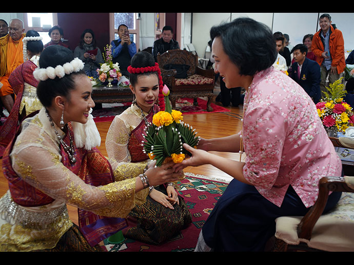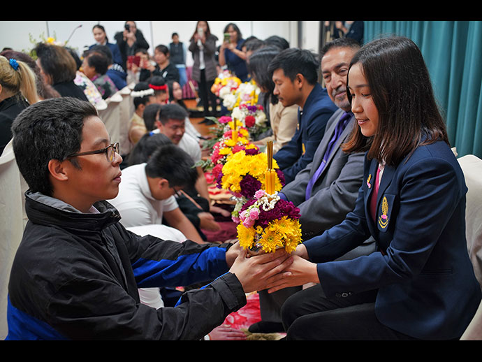 ความกตัญญูกตเวทีที่มีต่อครู มีจิตสำนึกผูกพันในความเป็นไทย เกิดความภาคภูมิใจมีความมั่นใจและพากเพียรยิ่งขึ้น ตลอดจนจงรักภักดีต่อชาติ ศาสนา และพระมหากษัตริย์นั้น แม้ฟ้าฝนไม่เป็นใจโปรยปรายลงมาอย่างหนักทั้งสองวัน แต่ผู้ปกครองกลับไม่ไยดีกับฟ้าฝนให้ความสำคัญกับพิธีไหว้ครูมากกว่า พาลูกหลานเข้าร่วมพิธีอย่างอบอุ่น โดยพิธีใน วันเสาร์ ครูแต๋ว สุวัฒนา ปิ่นวัฒนะ ครูอาวุโสซึ่งอยู่คู่กับโรงเรียนมาแต่เริ่มเปิดเรียนเมื่อปี 1974 หลังจากสร้างวัดได้ เพียง 2 ปี ให้เกียรติเป็นประธาน ส่วนวันอาทิตย์ ร้อยโทหญิงกรรภิรมย์ วิชาธร ผู้แทนท่านกงสุลใหญ่ ณ นครลอสแอนเจลิส ให้เกียรติเป็นประธาน หลวงพ่อใหญ่ ท่านเจ้าคุณพระเทพมงคลวิเทศ เจ้าอาวาส เมตตาเป็นประธานฝ่ายสงฆ์ทั้งสองวัน