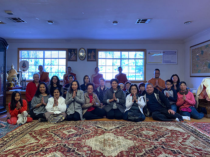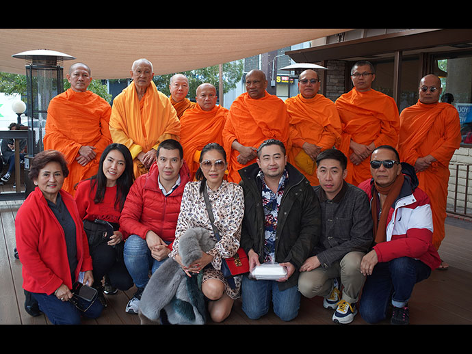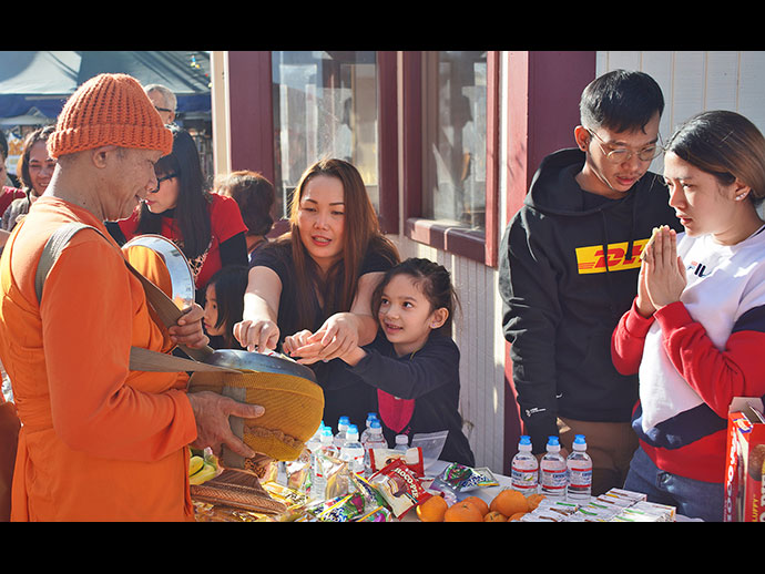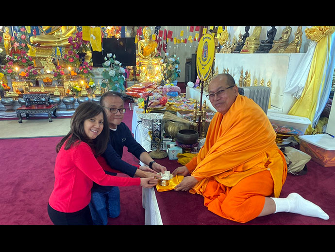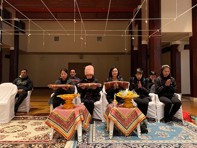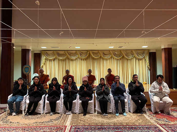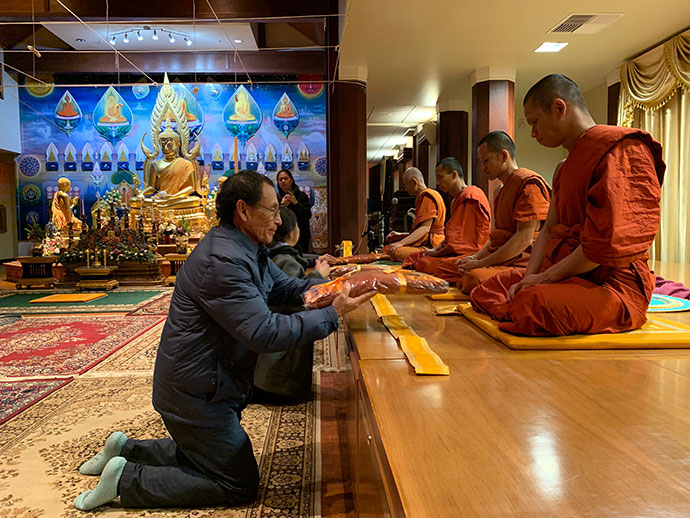 รุ่งเช้าวันพุธที่ 1 มกราคม 2563 เป็นพิธีทำบุญตักบาตรยามเช้าต้อนรับปีใหม่ พี่น้องไทยศรัทธามาร่วมทำบุญตักบาตร อย่างอุ่นหนาฝาคั่งเช่นเคย ไม่สนใจลมหนาวเย็นรอบข้างมีหน้าตาเอิบอิ่มด้วยรอยยิ้มสดใส หลวงพ่อใหญ่ ท่านเจ้าคุณพระ เทพมงคลวิเทศ นำพระสงฆ์วัดไทยฯ และวัดอื่นๆ ที่อยู่ในพื้นที่ใกล้เคียงกันจำนวน 50 รูป เดินลงจากอุโบสถศาลารับ บิณฑบาตจากญาตโยมที่ยืนเรียงรายรอบๆ อุโบสถศาลาถึงรอบครึ่ง ประมาณว่าพี่น้องไทยที่ศรัทธาร่วมบุญตักบาตร ไม่น่าจะต่ำกว่า 800 คน เพราะ ต่างก็เบียดเสียดกันใส่บาตรพระคุณเจ้าด้วยความแจ่มใส คณะวัดไทยฯ โดยหลวงพ่อใหญ่ ขออนุโมทนาบุญขอบคุณใน ศรัทธาของพี่น้องไทยทุกท่าน ขอให้ก้าวเดินบนเส้นทางชีวิตตลอดปีใหม่ด้วยจิตใจที่มั่นคง เข้มแข็งคงที่ไม่เปลี่ยนแปลง จิตใจที่มั่นคง คือจิตใจที่เข้าถึงธรรม ย่อมอยู่ในโลกนี้อย่างเป็นสุขยิ่ง และขอให้เจริญในธรรม ตลอดกาลเป็นนิตย์ เทอญฯ