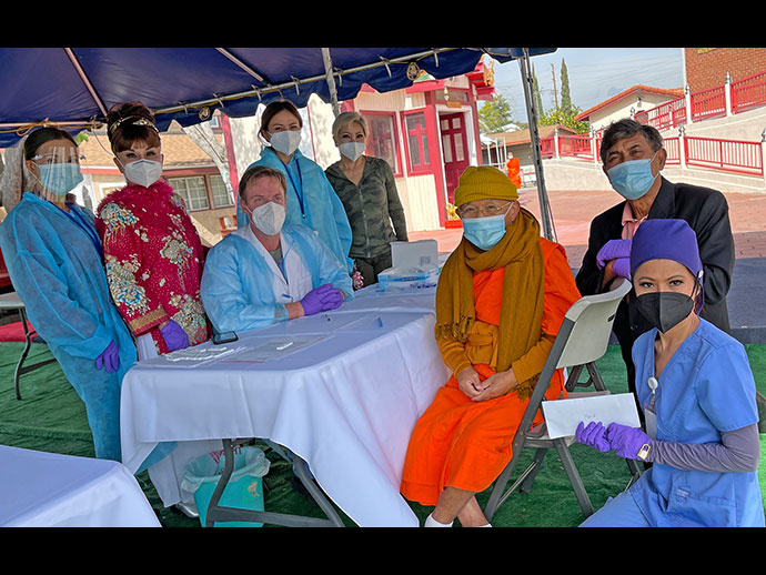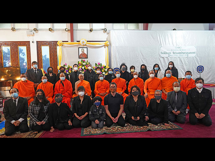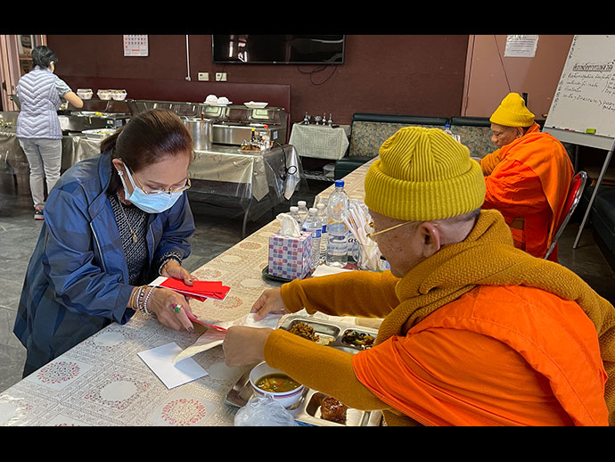 โครงการบิณฑบาตถวายอาหารเพลพระสงฆ์ที่วัดไทยฯ เดือนละครั้ง ในวันนี้เป็นวันอังคารที่ 3 ของเดือน คุณกนกวรรณ รอดโฉม แห่งร้านนาตาลี/House of Pies คุณพัชรี นาดี/ร้านอรุณี คุณเพ็ญแข ติลกมนกุล คุณแม้ว รุจา ตุลาภรณ์/McDonald และเพื่อนๆ ร่วมกันเป็นเจ้าภาพ นอกจากนี้ยังมีญาติโยมอีกหลายท่านได้นำอาหารมาทำบุญถวายเพลอีกหลายเจ้า ท่ามกลางสถานการณ์โควิด ทุกคนต่างก็รักษากฎระเบียบ Social distancing ใส่หน้ากาก สวมถุงมือกันทุกคน แม้ว่าทั้งพระสงฆ์และญาติโยมส่วนใหญ่จะได้รับการฉีดวัคซีนป้องกันโควิดกันแล้วก็ตาม หลังจากถวายอาหารแล้ว พระสงฆ์ได้ออกมาด้านนอกเพื่ออนุโมทนาบุญ เจริญพระพุทธมนต์ให้พร ญาติโยมกรวดน้ำอุทิศส่วนกุศลและรับพร