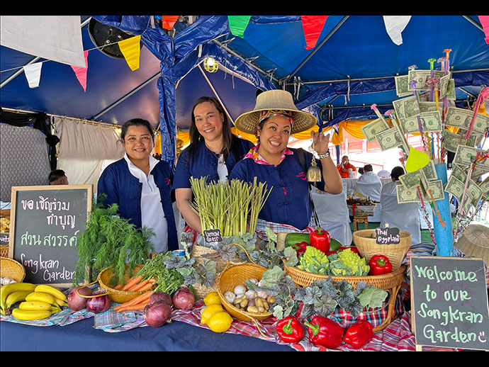 ขออนุโมทนาบุญ คุณหนิง จารีณี ฟิลลิปส์ น้องแคนดี้ กระจ่างศรี เจ้าหน้าที่ของ ททท. แอลเอ และน้องเมย์ ณัฏฐินี ทอมป์สัน ที่พร้อมใจกันเนรมิตร “สวนสวรรค์วันสงกรานต์” อันสวยงามและอบอวลด้วยผักผลไม้และสมุนไพรไทย มอบเป็นบรรณาการให้กับญาติโยมที่ไปร่วมบุญสงกรานต์ นับเป็นกิจกรรมแปลกใหม่ที่น้องๆ อดีตนักเรียนวัดไทยฯ สรรสร้างให้ญาติโยมพี่น้องไทยได้มีส่วนร่วมในบุญ สาธุ