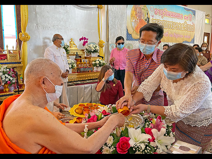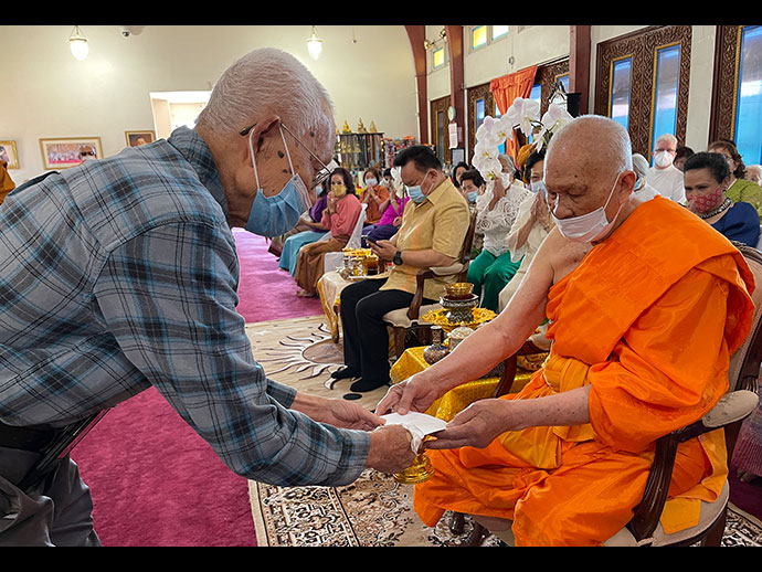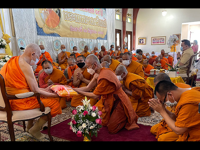 งานบุญพิธีฉลองสิริอายุวัฒนมงคลครบรอบ 89 ปี หลวงพ่อใหญ่ พระเทพมงคลวิเทศ เจ้าอาวาสวัดไทยลอสแองเจลิส และที่ปรึกษาสมัชชาสงฆ์ไทยในสหรัฐอเมริกา โดยคณะสงฆ์และกรรมการวัดพร้อมใจกันจัดถวาย เมื่อเช้าวันเสาร์ที่ 12 มิถุนายน ที่ผ่านมา ซึ่งตรงกับวันเกิดของพระคุณท่านพอดี เป็นพิธีที่เรียบง่ายแต่สมบูรณ์แบบตามประเพณีที่ปฏิบัติกันสืบมา และสอดคล้องกับสถานการณ์ป้องกันไวรัสโควิด หลวงพ่อใหญ่ได้ทำบุญตักบาตรพระสงฆ์จากวัดต่างๆ ไม่ต่ำกว่า 50 รูป ฟังพระสงฆ์เจริญพระพุทธมนต์ ถวายไทยธรรมและแจกข้าวสารให้ญาติโยมที่ศรัทธามาร่วมบุญอย่างอบอุ่น คณะสงฆ์วัดไทยฯ ขออนุโมทนาบุญญาติโยมทุกท่าน ขอบุญบารมีที่ได้บำเพ็ญร่วมกัน และบารมีคุณพระศรีรัตนตรัย โปรดบันดานให้ทุกท่านประสบแต่สิ่งดีงามในชีวิต และเจริญสิริสวัสดิ์ด้วยจตุรพิธพรชัยตลอดกาลนาน