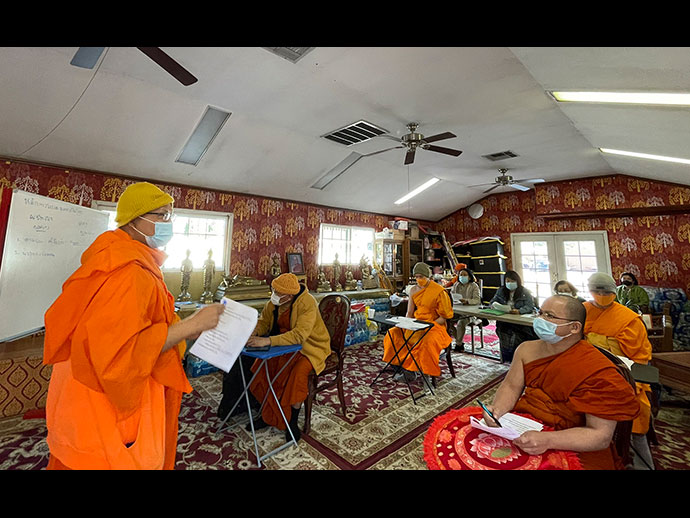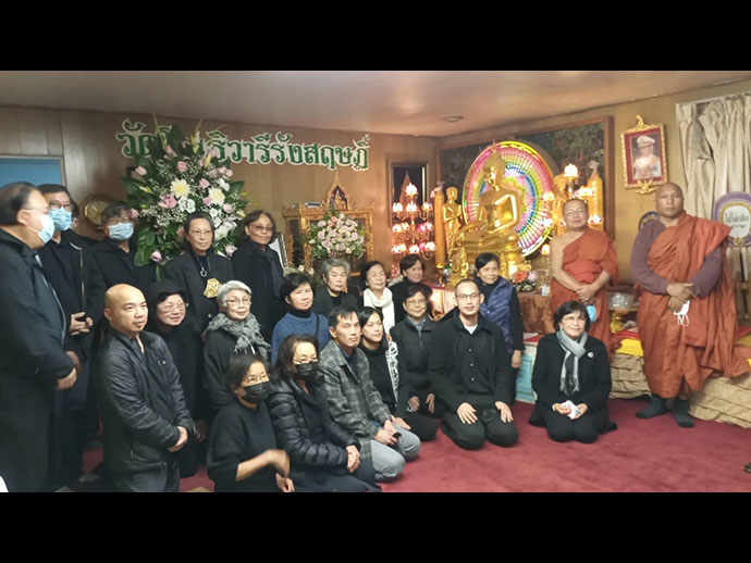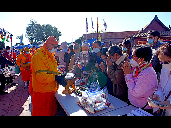 งานมงคลพิธี “สวดมนต์ข้ามปี” ส่งท้ายปีเก่าด้วยวิถีไทย และต้อนรับปีใหม่ด้วยวิถีพุทธ เมื่อค่ำวันศุกร์ที่ 31 ธันวาคม 2564 ซึ่งเริ่มพิธีระหว่างเวลา 19.00-24.00 น. โดยเป็นการสวดนพเคราะห์ตามกำลังวันและสวดอิติปิโส 108 จบ พระครูสังฆรักษ์เยือนศรัณย์ ประธานสงฆ์ในพิธี พรมน้ำพระพุทธมนต์อวยพรให้ประสบแต่สิ่งดีงามในชีวิตปีใหม่ รุ่งเช้าวันเสาร์ที่ 1 มกราคม 2565 เวลา 09.30 น. พี่น้องไทยยืนเรียงรายรอบๆ อุโบสถศาลาประเมินแล้วไม่ต่ำกว่า 300 ท่าน คอยใส่บาตรพระสงฆ์ธรรมทูต 35 รูป นำโดยหลวงพ่อใหญ่เดินเรียงแถวรับบิณฑบาตจากญาติโยม 1 รอบเต็มๆ ญาติโยมพากันใส่บาตรด้วยความแจ่มใสเบิกบานดวงหน้าเปี่ยมสุข ไม่นำพาต่ออากาศหนาวเย็นรอบด้าน คณะสงฆ์วัดไทยฯ และวัดต่างๆ ในเขตใกล้เคียงที่เมตตารับบิณฑบาต ก็ขออนุโมทนาบุญมา ณ โอกาสนี้ ขอให้เจริญสิริสวัสดิ์พิพัฒนมงคลด้วยอายุ วรรณะ สุขะ พละ ตลอดปีใหม่นี้ เทอญฯ