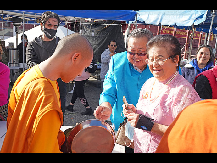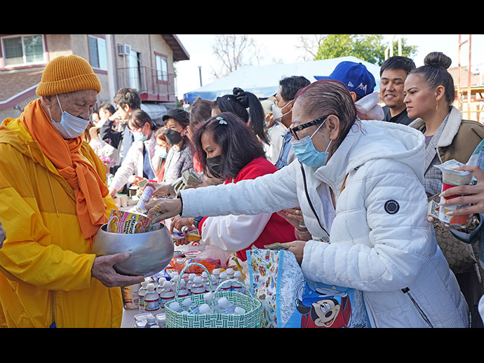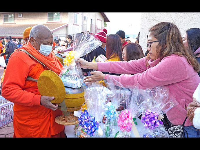 รุ่งเช้าวันอาทิตย์ที่ 1 มกราคม 2566 เป็นกิจกรรมทำบุญตักบาตรเนื่องในวันขึ้นปีใหม่ 2566 ญาติโยมมากมายศรัทธาใส่บาตรพระคุณเจ้ารอบๆ อุโบสถศาลาอย่างเนืองแน่น หลวงพ่อใหญ่นำพระสงฆ์วัดไทยฯ และวัดอื่นๆ ในเขตใกล้เคียง รับบิณฑบาต 1 รอบครึ่ง ประมาณจำนวนญาติโยมไม่ต่ำกว่า 500 คน ท่านกงสุลใหญ่ ณ นครลอสแอนเจลิส คุณต่อ ศรลัมพ์ และภริยา กรุณาร่วมบุญเป็น "ลูกศิษย์วัดไทย" ถ่ายของจากบาตรของพระคุณเจ้าอย่างแข็งขัน ขออนุโมทนาบุญญาติโยมทุกท่าน ขอกุศลผลบุญที่ได้บำเพ็ญในวันขึ้นปีใหม่ โปรดบันดาลให้ทุกท่านประสบสุขสิริสวัสดิ์ด้วยจตุรพิธพรชัย เจริญรุ่งเรืองในหน้าที่การงาน เจริญศรีมั่งมีเงินทองตลอดกาล เทอญฯ