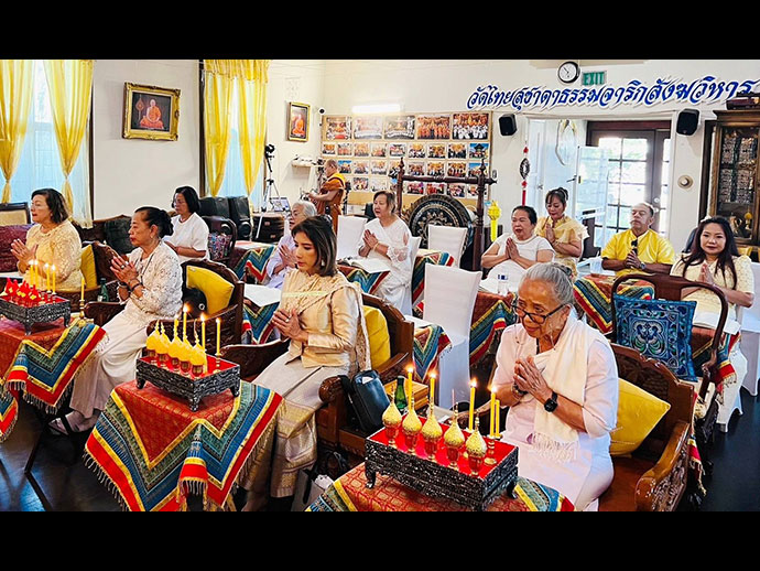 วันอาทิตย์ที่ ๒๘ กรกฎาคม พ.ศ. ๒๕๖๗ เมื่อเวลา ๑๗.๓๐ น. โดยมีนางนุชนาฏ อุงอำรุง นายกสมาคมไทยแห่งแคลิฟอร์เนียภาคใต้ เป็นประธาน เปิดกรวยถวายเครื่องราชสักการะหน้าพระบรมฉายาลักษณ์ และอ่านพระวรธรรมคติสมเด็จพระสังฆราช จากนั้นร้องเพลงสรรเสริญพระบารมี จากนั้นคุณสายสุนีย์ และสามีเป็นประธานจุดธูปเทียนบูชาพระรัตนตรัย คุณนุชนาฏ อุงอำรุง คุณปรียานุช คุณจิดาภา ผดุงศิลป์ไพโรจน์ คุณวิรังรอง ถาวโรทิพย์ จุดเทียนกระบะนมัสการบูชาเจริญพระพุทธมนต์นวัคคหายุสมธัมม์ คุณแซนดี จุดเทียนน้ำมนต์ คุณแม่บัวจุดเทียนเครื่องทองน้อง แสดงพระธรรมเทศนา ดร.สริตา สังข์เฉย จุดเทียนส่องธรรม จากนั้นมัคนายกนำไหว้พระรับศีล อาราธนาธรรม พระครูพิศาลธรรมจารี เจ้าอาวาส แสดงพระธรรมเทศนา 1 กัณฑ์ วชิโรปมกถา จบแล้ว อาราธนาพระปริตร พระสงฆ์และอุบาสกอุบาสิกา เจริญพระพุทธมนต์ถวายพระพร เจริญสติภาวนา ถวายเป็นพระราชกุศล