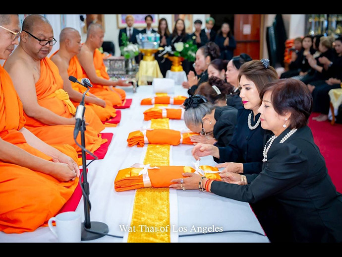 พิธีบำเพ็ญกุศลสวดพระอภิธรรรมอุทิศถวายแด่ สมเด็จพระนางเจ้าสิริกิติ์ พระบรมราชินีนาถ พระบรมราชชนนีพันปีหลวง พระผู้เสด็จสู่สวรรคาลัย เมื่อวันที่ 24 ตุลาคมที่ผ่านมา ณ วัดไทยลอสแอนเจลิส ซึ่งสมัชชาสงฆ์ไทยในสหรัฐอเมริกา สถานกงสุลใหญ่ ณ นครลอสแอนเจลิส สมาคมชมรมต่างๆ ร่วมใจน้อมเกล้าฯ จัดพิธีสวดพระอภิธรรมถวายพระราชกุศลทุกคืน เป็นเวลา 30 วัน โดยเริ่มตั้งแต่คืนวันที่ 26 ตุลาคมเป็นต้นมานั้น ขออนุโมทนาบุญต่อมวลพสกนิกรชาวไทยในนครลอสแอนเจลิส ทั้งที่เป็นในนามสมาคม ชมรมต่างๆ หน่วยงานราชการและเอกชน ที่แจ้งความจำนงขอเป็นเจ้าภาพในพิธีสวดพระอภิธรรมอุทิศถวายพระราชกุศลอย่างต่อเนื่อง แสดงถึงความจงรักภักดีต่อสถาบันสำคัญศูนย์รวมใจไทยทั้งชาติ ไม่ว่าจะอยู่ในหรือต่างประเทศด้วยสำนึกในพระมหากรุณาธิคุณเป็นล้นพ้นหาที่สุดมิได้