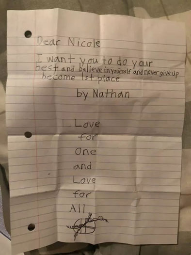ก่อนที่นิโคลีนจะบินไปชิงมง ที่เมืองซานย่า จีน น้องเนตั้นได้เขียนจดหมายลายมือน่ารัก ข้อความสุดอบอุ่น จากแคลิฟอร์เนีย สหรัฐอเมริกา ให้นิโคลีนพี่สาวสุดสวย เอาไว้ว่า Love For One And Love For All...by Nathan