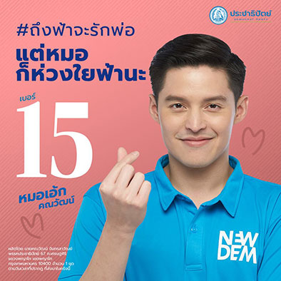 “หมอเอ้ก-คณวัฒน์ จันทรลาวัณย์”สมาชิกกลุ่ม ‘นิว เดม’(NEW DEM)คนรุ่นใหม่พรรคประชาธิปัตย์ ลงสมัครพื้นที่ กทม. เขต 7 บางซื่อ-ดุสิต (แขวงถนนนครไชยศรี) ... แน่นอนว่ากระแส #ฟ้ารักพ่อ กำลังฟีเวอร์ติดเทรนด์ทวิตเตอร์ แต่พรรคเก่าแก่ระดับนี้ ก็ไม่พลาดที่จะยิงวลี #ถึงฟ้าจะรักพ่อ # แต่หมอก็ห่วงใยฟ้านะ ... ทำเอาฟังแล้วถึงกับใจละลาย