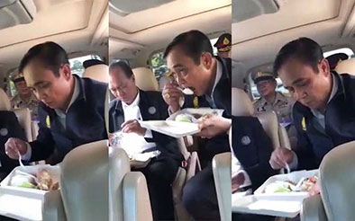เครื่องบินขัดข้อง บิ๊กตู่ บิ๊กป๊อก กินข้าวกล่องบนรถ โบกมือทักทายปชช.