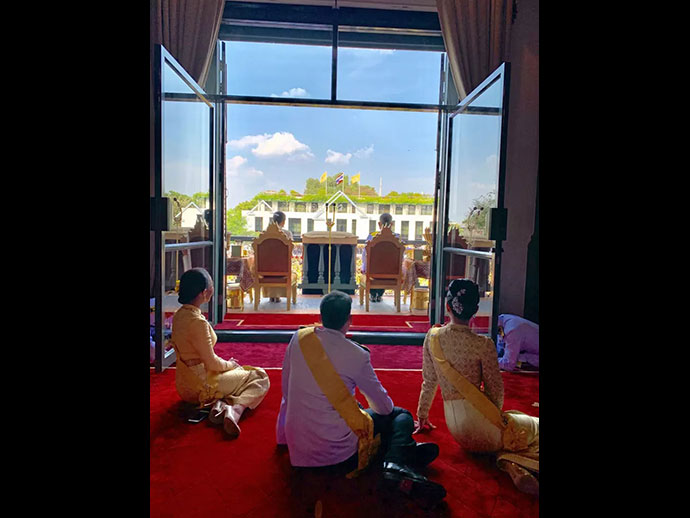 เวลา 16.55 น. พระบาทสมเด็จพระวชิรเกล้าเจ้าอยู่หัว พร้อมสมเด็จพระนางเจ้าสุทิดาฯ พระบรมราชินี เสด็จขึ้นท้องพระโรง พระที่นั่งสุทไธสวรรย์ปราสาท โดยมีพระบรมวงศานุวงศ์ พระราชวงศ์ และองคมนตรี เฝ้าทูลละอองธุลีพระบาทรับเสด็จ ผู้แทนทุกหมู่เหล่าเข้าเฝ้าฯ ถวายพระพรชัยมงคล