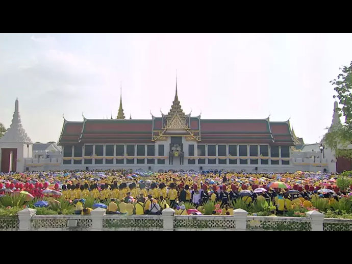 เวลา 16.59 น. เสด็จออกสีหบัญชร โดยพระบาทสมเด็จพระเจ้าอยู่หัวทรงโบกพระหัตถ์ แย้มพระสรวล ท่ามกลางเสียงประชาชนเปล่งเสียงดัง “ทรงพระเจริญ” อย่างกึกก้อง