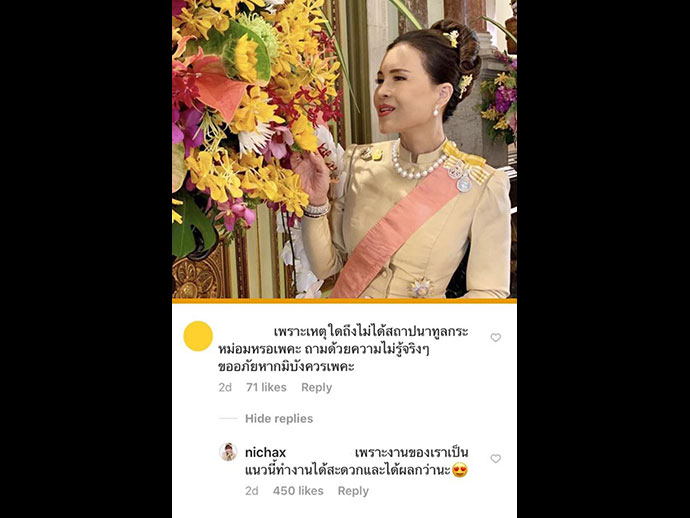 "ไม่ได้เข้าร่วมวันนี้ค่ะ" และยังตอบว่า "ยังมีรูปจะแชร์เยอะเลย!😍" เมื่อมีผู้ระบุว่ารอชมพระสิริโฉมอยู่