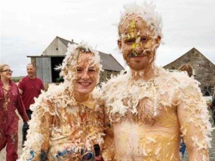ภาพหมายเลข 1. ตามธรรมเนียมของชาวสก็อตแลนด์ ญาติ พี่น้อง เพื่อนเจ้าสาว จะมาช่วยกันรุมนำสิ่งสกปรก เน่าเหม็นต่างๆ มาราดบนตัวของเจ้าบ่าว-เจ้าสาว และพวกเขานั้นก็จำเป็นที่จะต้องไปปาร์ตี้ต่อในขณะที่ตัวมีกลิ่นเน่าเหม็นแบบนั้นด้วย ซึ่งเหตุผลที่ทำแบบนี้เนื่องจากเป็นการเตรียมความพร้อมสู่ชีวิตลำบากหลังจากการแต่งงานนั่นเอง